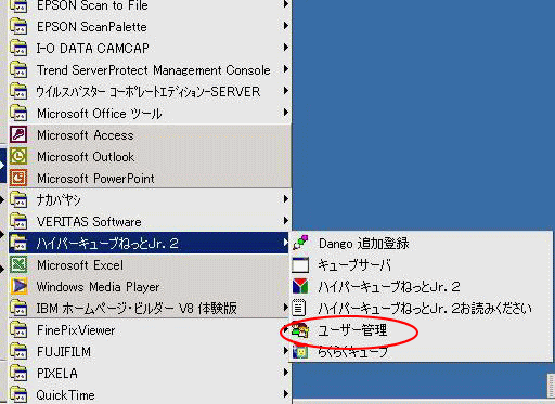 まず、すべてのプログラムからハイパーキューブねっとJr2を選び、ユーザー管理をクリックします。