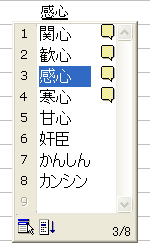 1回スペースキーを押しても 思ったとおりの漢字にならなかったときは その漢字が出てくるまでスペースキーを押します。 青くなっている部分が、今選ばれている漢字です。 もし通り過ぎたら、上矢印キーを押して戻ります。 そして正しい漢字のところでエンターキーを押して、確定します。 |
