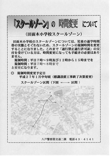 平成27年1月14日よりスクールゾーン通行規制時間が変更になりました。