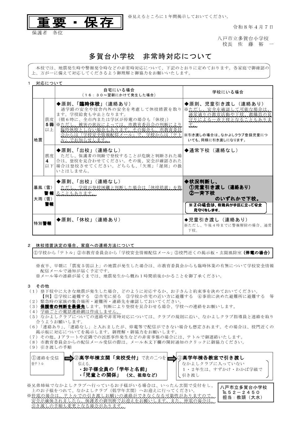 多賀台小学校の非常時対応です。